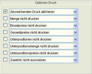 An den Belegpositionen wird überdeckend zu den belegbezogenen Optionsfelder gesteuert, ob der Platzhalter für ein bestimmtes Datenfeld mit dem Feldinhalt ersetzt wird oder leer bleibt (nicht gedruckt wird). Die Einstellungen werden mit der Checkbox „abw.“ (Drucken) aktiviert. |